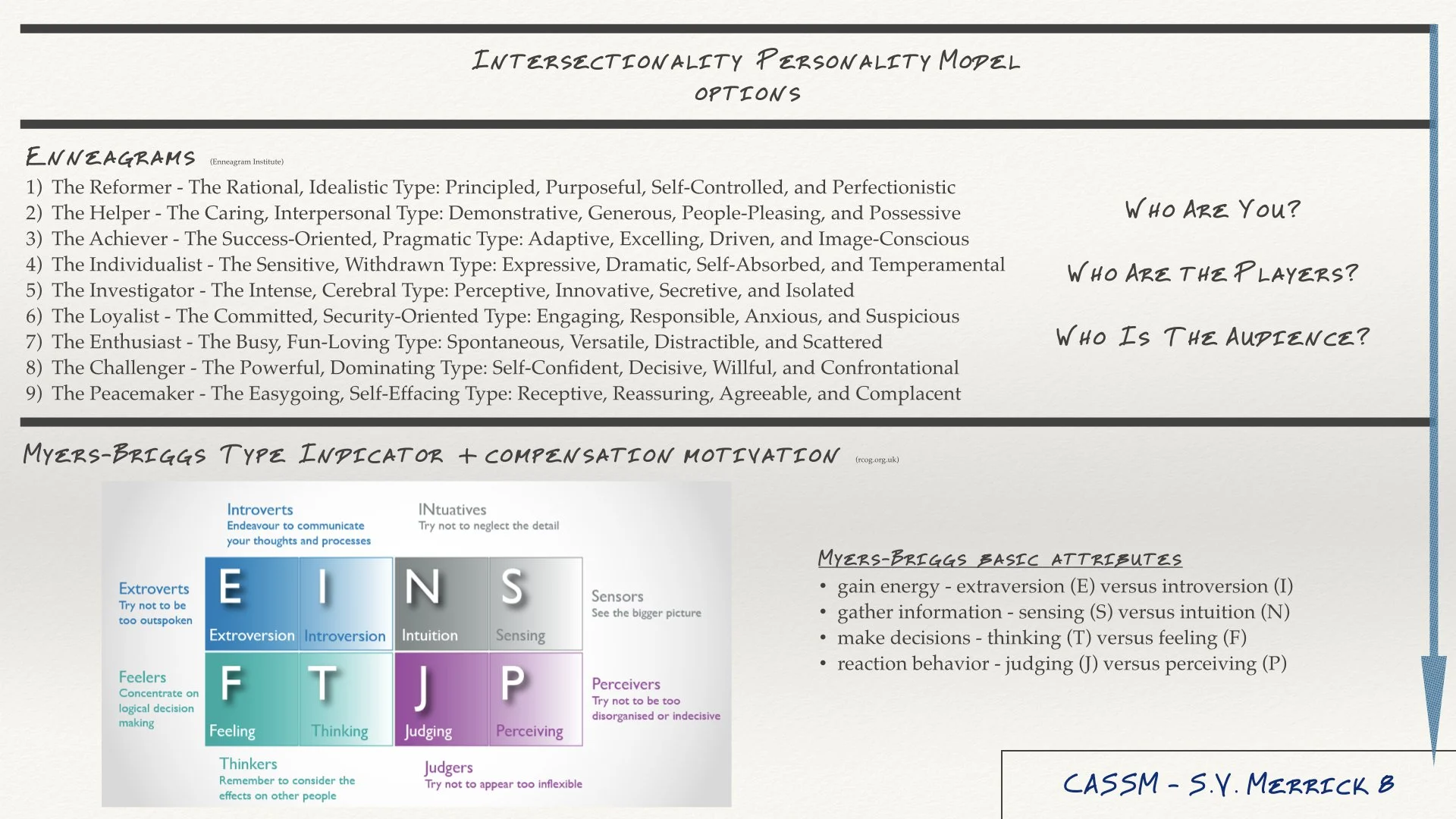 There are many ways to source personalities - from the whimsical, such as tarot cards or the mystical icons from the studies of Joseph Campbell and Carl Jung, to the practical, such as Myers-Briggs and the Big 5 Personality Types. Many people have methodically considered the importance of personality types for professional and organization purposes. Personality types are obviously necessary for entertainment narrative or for the fantastical stories that coalesce ethnic and national identities. How do the personalities in your proximity anchor or dynamically challenge your world view?